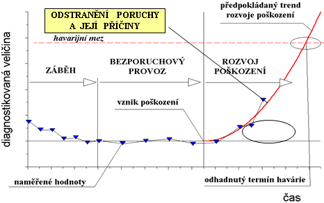 Jedním z hlavních nástrojů technické diagnostiky strojů je analýza trendu. Trend zobrazuje průběh diagnostikované, měřené veličiny v čase. V údržbě strojů je důležité zajistit provozuschopnost strojů s využitím sledování trendu vhodné diagnostické veličiny. V technické diagnostice strojů je důležité sledovat vývoj měřené diagnostické veličiny v čase, nikoliv sledovat pouze okamžité hodnoty diagnostické veličiny. Okamžité hodnoty lze využít například pro analýzu závad, ale nejsou vhodné pro hodnocení zbytkové životnosti. V případě neznámého (z pohledu diagnostiky) stroje nemusí být zřejmé, zda jsou měřené veličiny mimo požadovaný rozsah. Pouze sledování měřené veličiny z dlouhodobého pohledu nám může poskytnout požadované informace. Analýza trendu je rekonstrukcí tzv. "vanové křivky", která popisuje typický technický život diagnostikovaného uzlu na stroji mezi jeho přejímkou a obnovou. Analýzou odhadujeme budoucí vývoj na základě provedených měření z minulosti. Konstrukce a tvar vanové křivky je pro každý diagnostikovaný uzel jedinečná. Vanová křivka začíná obdobím záběhu. Přesným začátkem by mělo být převzetí stroje, protože v tento okamžik by měl být stroj bez závad a všechny měřitelné diagnostické veličiny by měly být v předepsaných mezích. V období záběhu trendové veličiny klesají a stabilizují se. Pokud jsou diagnostické veličiny získávány pochůzkově, zkracují se periody sběru dat. Po záběhu následuje období bezporuchového provozu. Toto období by mělo být nejdelším obdobím v technickém životě stroje (i ve vanové křivce). V tomto období se obvykle prodlužuje doba sběru dat. Měřený diagnostikovaný uzel pracuje normálně a stroj je vystaven předpokládanému provoznímu zatížení. Provozem stroje se zkracuje jeho životnost. V neznámém okamžiku dojde k výskytu únavového poškození a měřený signál začne na toto poškození reagovat. Pro toto období je charakteristický rozvoj poškození a růst měřené diagnostikované veličiny. V tuto chvíli přichází na řadu analýza trendu. Úkolem této analýzy je odhadnout zbytkovou životnost měřeného uzlu. Limitním je dosažení havarijní meze diagnostikované veličiny. Po překročení této meze je již riziko poškození stroje příliš vysoké. Perioda sběru dat se v této fázi vanové křivky zkracuje a přizpůsobuje se vývoji poškození. Nová naměřená data pomáhají upřesnit vývoj trendu. Analýza trendu se provádí na základě naměřených dat. K tomu je používána aproximace s využitím křivky prvního nebo druhého řádu (přímka nebo parabola). Analýza trendu je vlastně odhad zbytkové doby, po kterou je možné stroj ještě používat do dosažení havarijní meze diagnostikované veličiny. Při dosažení havarijní meze je nutné měřený uzel opravit nebo vyměnit. Po této obnově začne sledování vanové křivky znovu od začátku. |